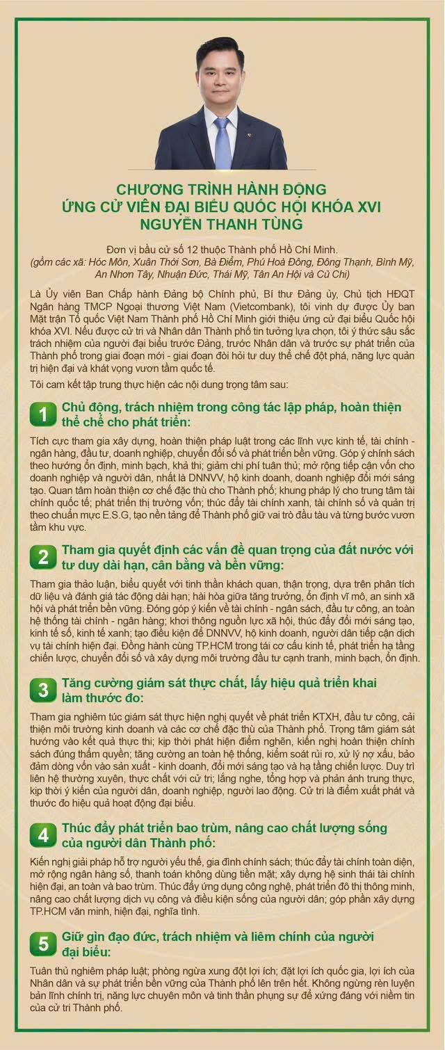 Đồng chí Nguyễn Thanh Tùng - Ủy viên Ban Chấp hành Đảng bộ Chính phủ, Bí thư Đảng ủy, Chủ tịch HĐQT Vietcombank được giới thiệu ứng cử đại biểu Quốc hội khóa XVI (nhiệm kỳ 2026 - 2031) tại đơn vị bầu cử số 12, TP. Hồ Chí Minh, với sự tín nhiệm cao của cử tri nơi công tác và nơi cư trú.